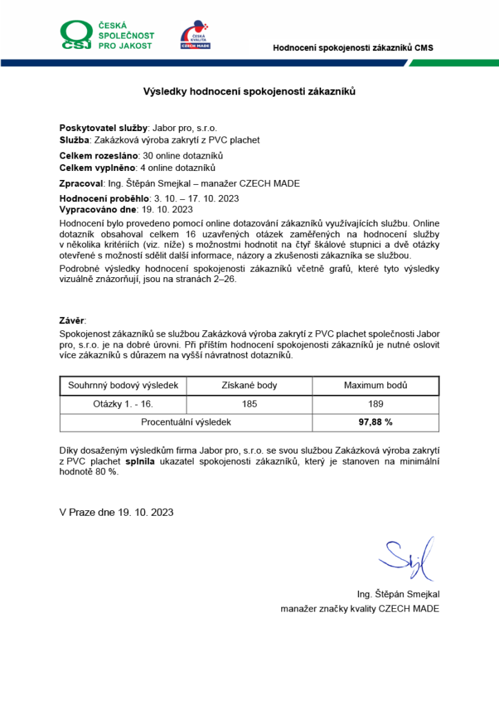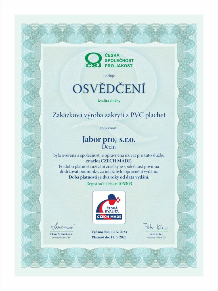 Systém kvality je certifikován ověření kvality služby „Zakázková výroba zakrytí z PVC plachet” podle Směrnice ČSJ-CMS č. 0002/2021. Nezávislý průzkum spokojenosti našich zákazníků provedený certifikační autoritou CZECH MADE ukázal velmi vysoké hodnocení, a to s celkovým výsledkem 97,88 %. Díky prokazatelným souhrnným výsledkům naše společnost Jabor pro, s.r.o získala značku kvality ČESKÁ KVALITA – CZECH MADE.